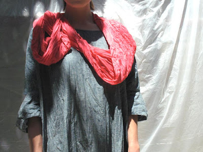 Circled Circle scarfbyROWENA SARTINCrinkled silk charmeuseLoop it, drape it, head wrap it72” L x 21” W Available HERE: http://store.ikoikospace.com/Circle-Scarf-p152.html