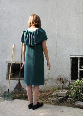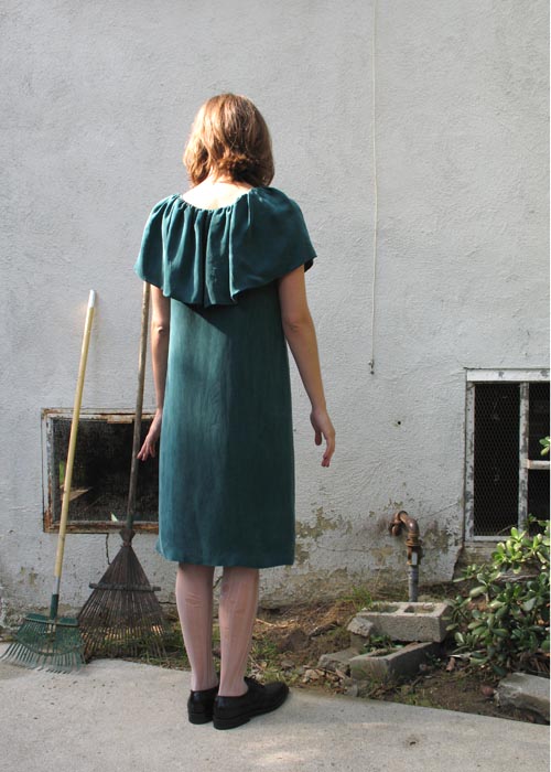 Neckline accentuation Rowena SartinRUFFLED COLLAR COLUMN DRESS:Straight shift shape with fluffy flounce neckline Washed rayon in forest green and black