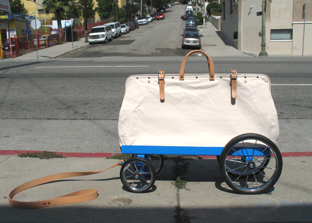 A “carry all” on wheels, WAGON No. 1— with custom designed metal frame with full swivel axle (easy steering), classic canvas mason bag with natural leather fasteners and leash, powder coated for long lasting weather proofing.