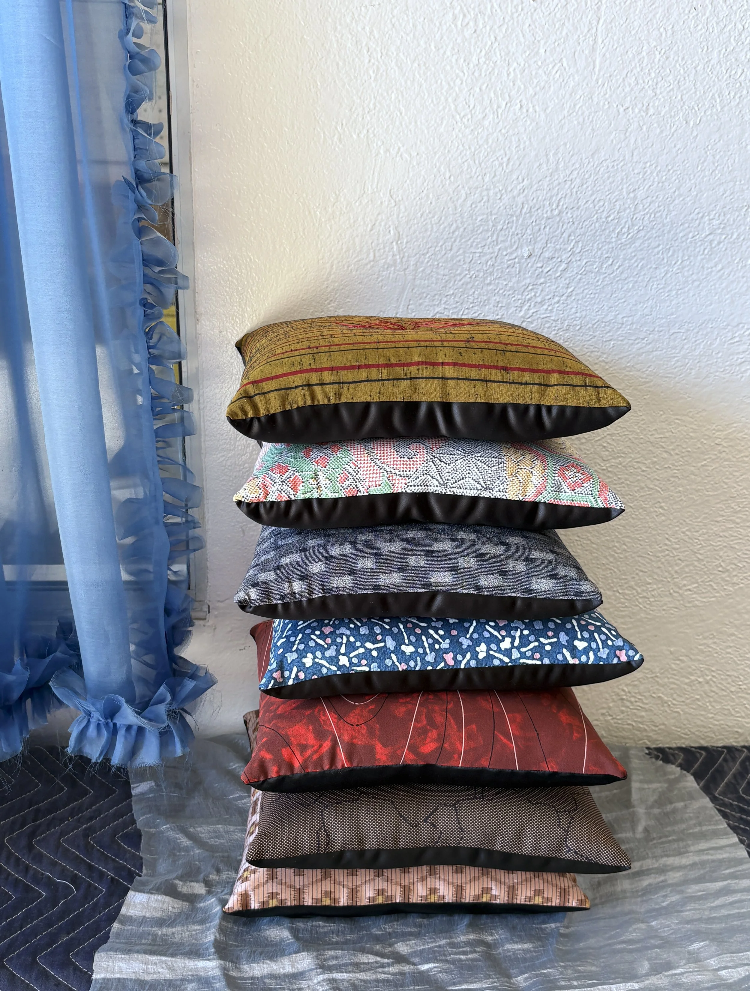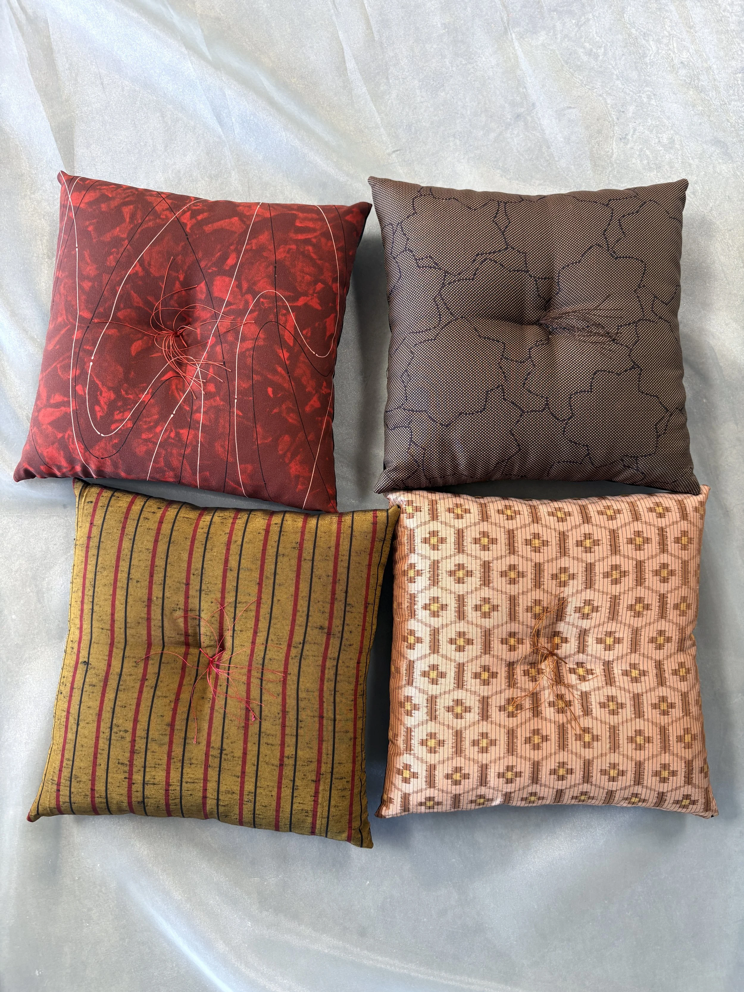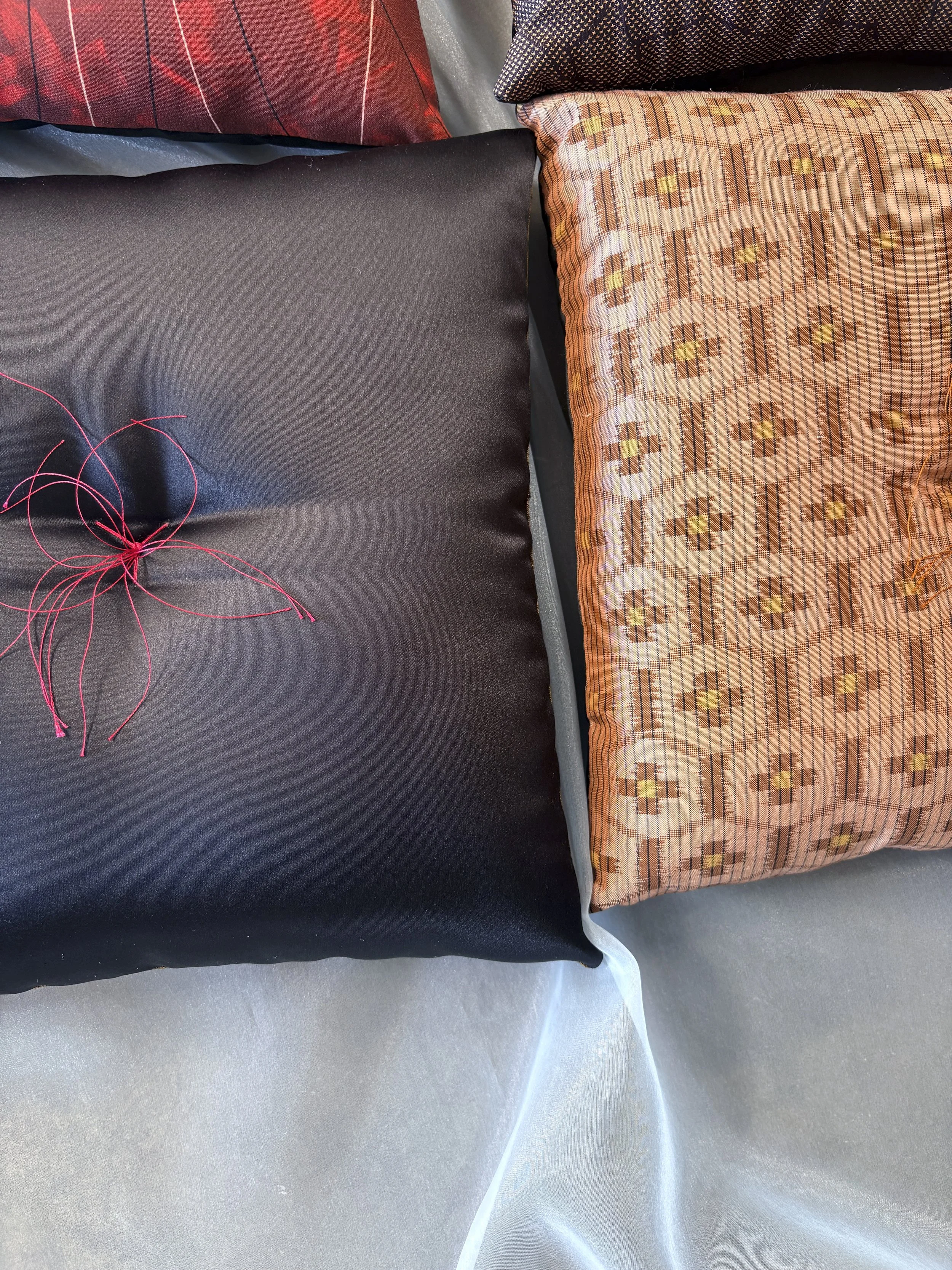 Vintage Japanese silk prints from Kyoto. Finite florals, pattern repeats, styled lines, ancient colorways. Flip side is soft Japanese polyester satin. Made in Kyoto with the Kyoto specific tassel.