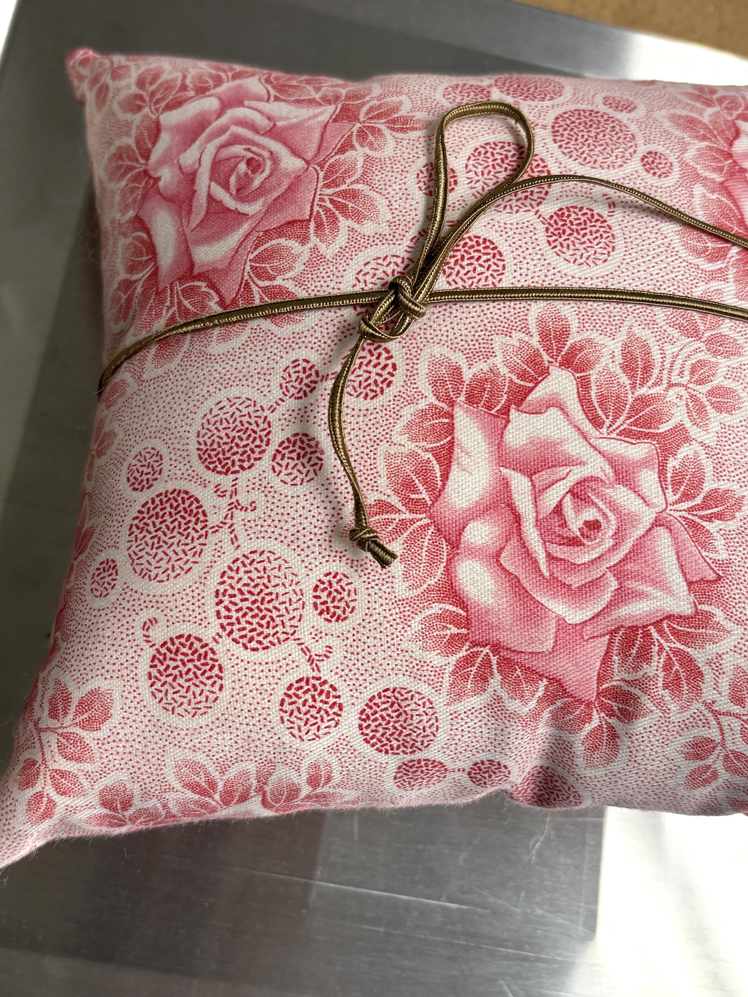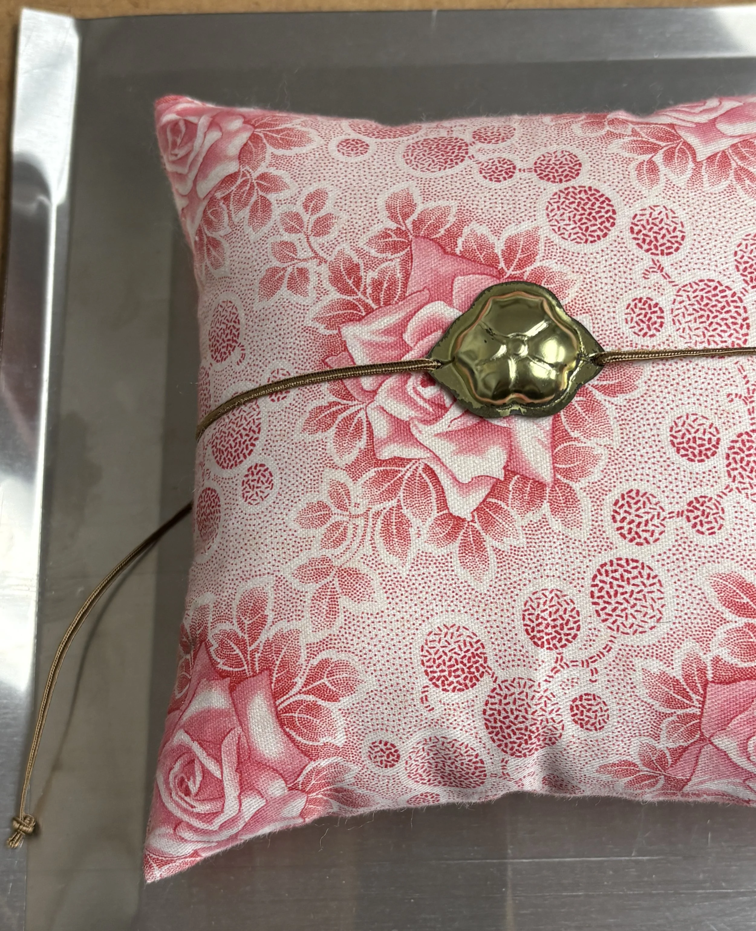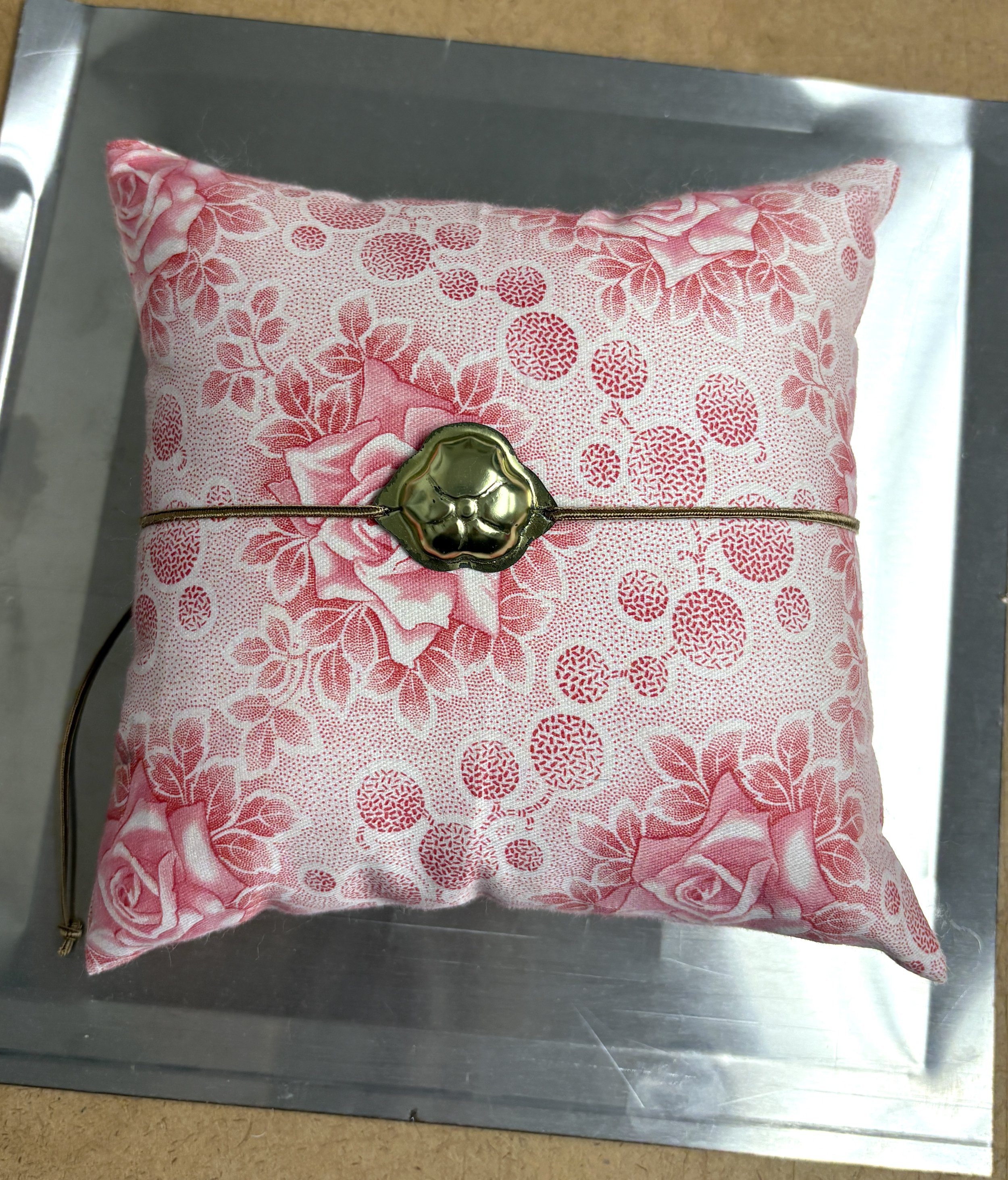 Reclaimed Japanese cotton print, vintage metal cherry blossom mold, polyester cord, wool fill.