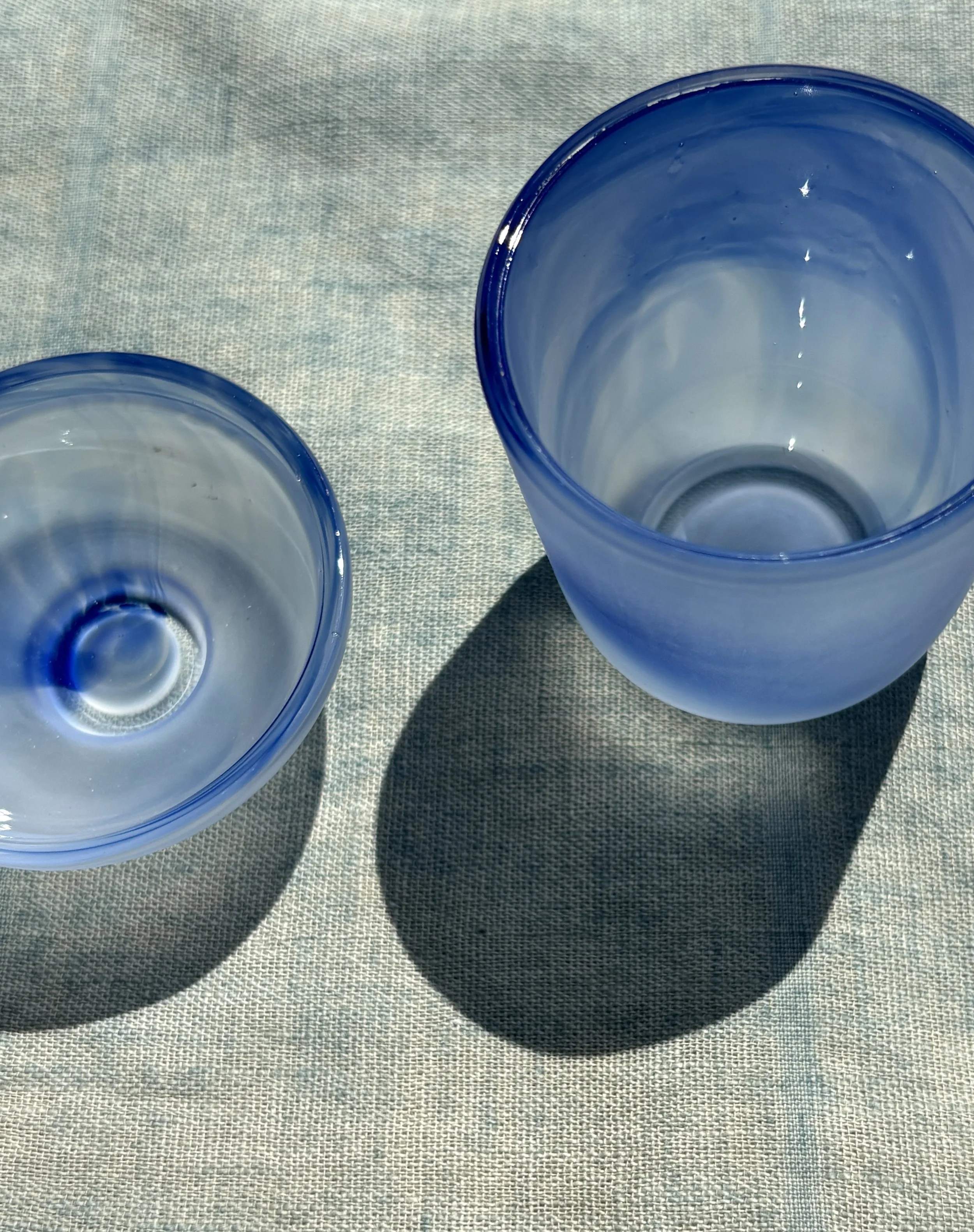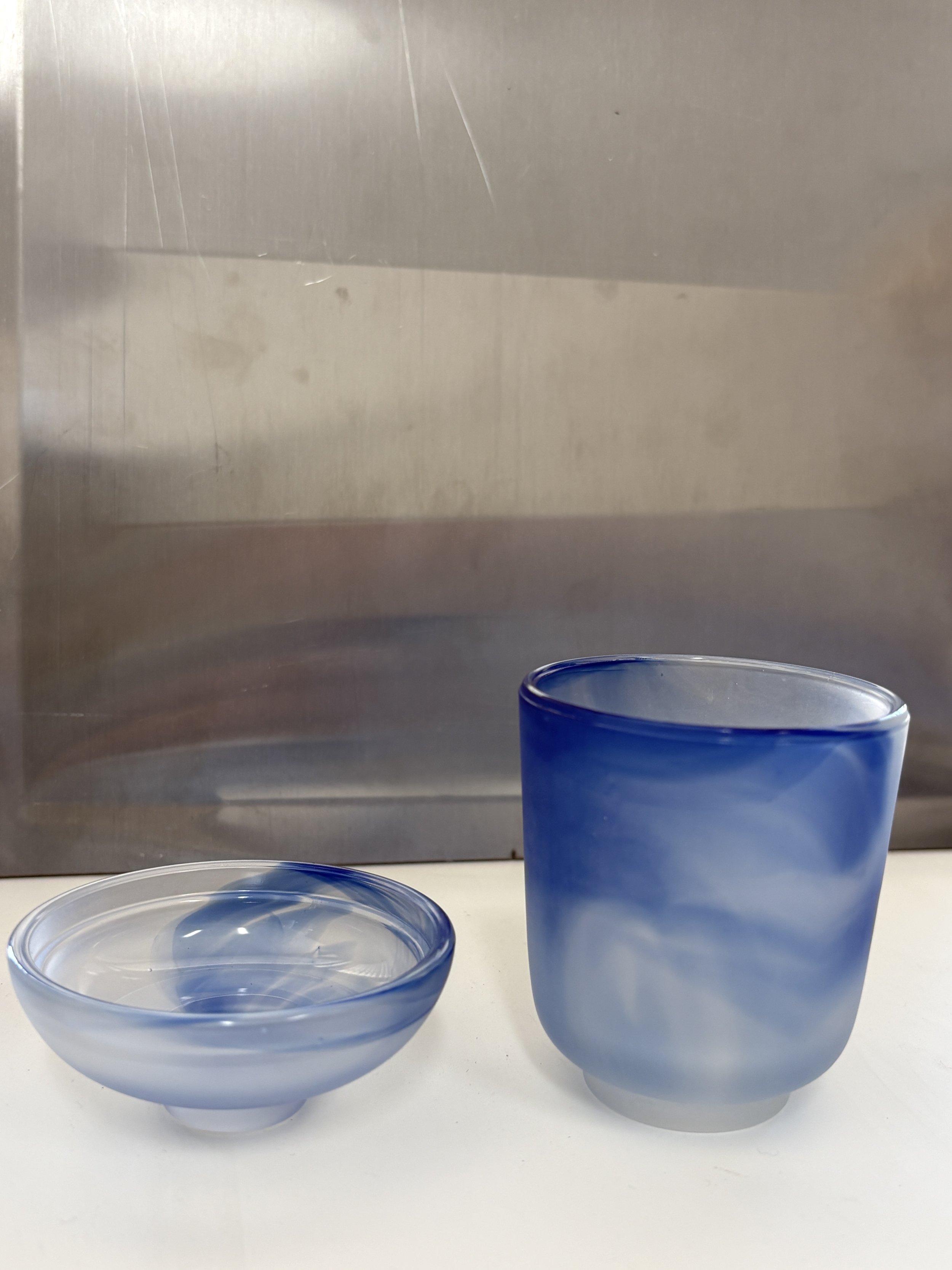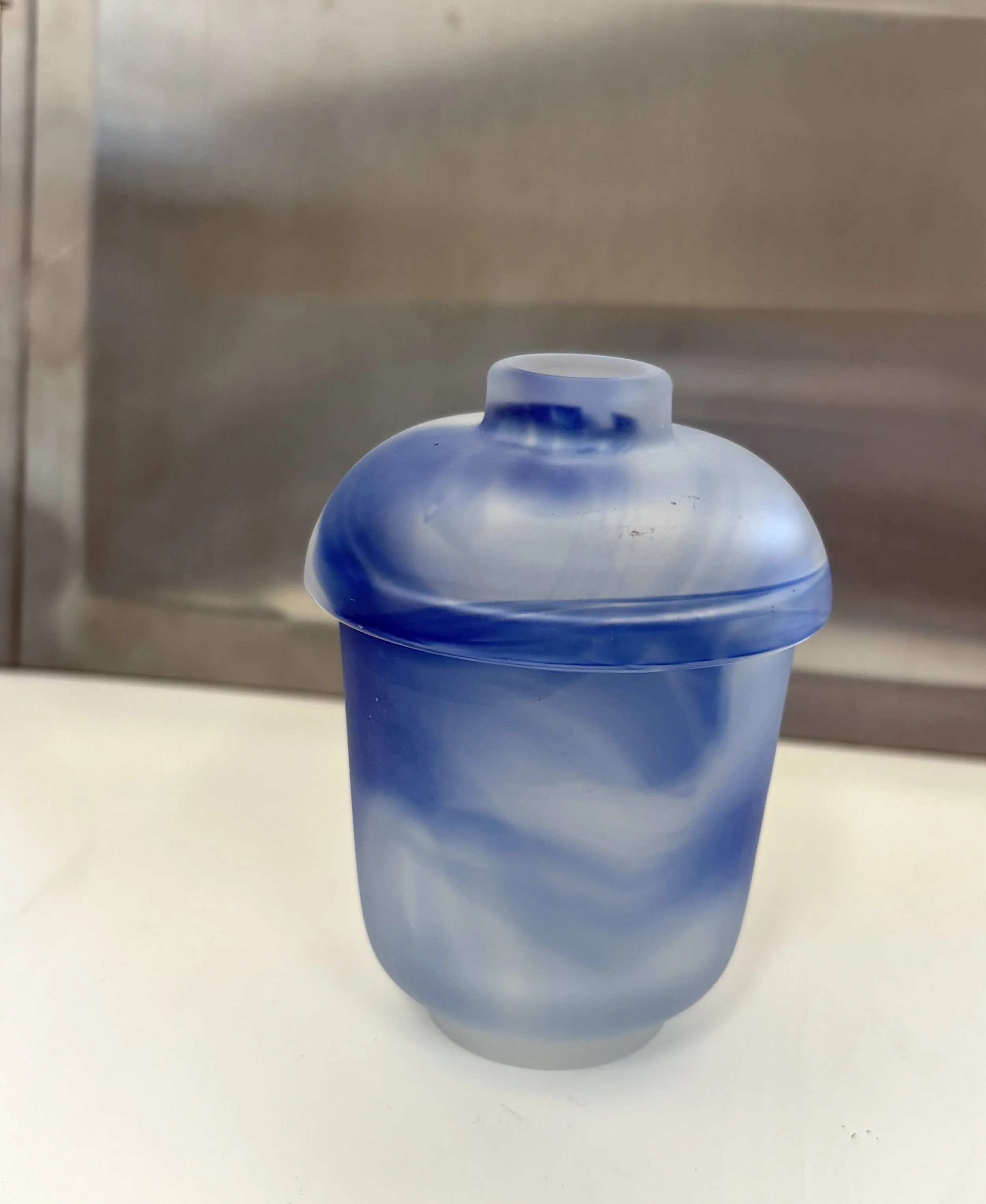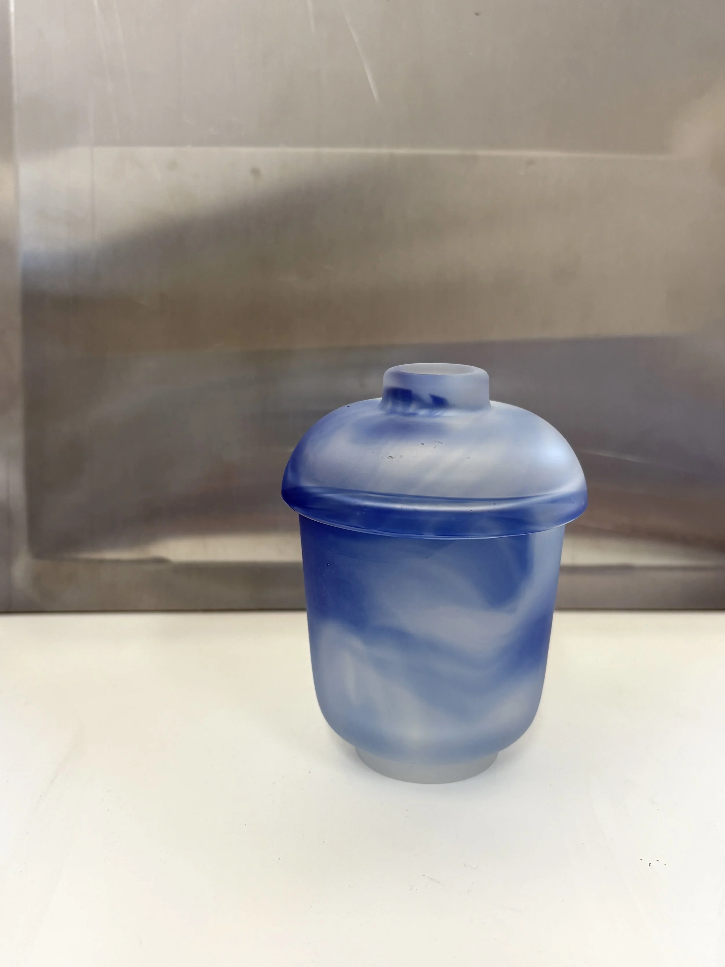 A sky and sea swirled glass container with lid. For tea leaves, spices, condiments, custard, beads, pins.